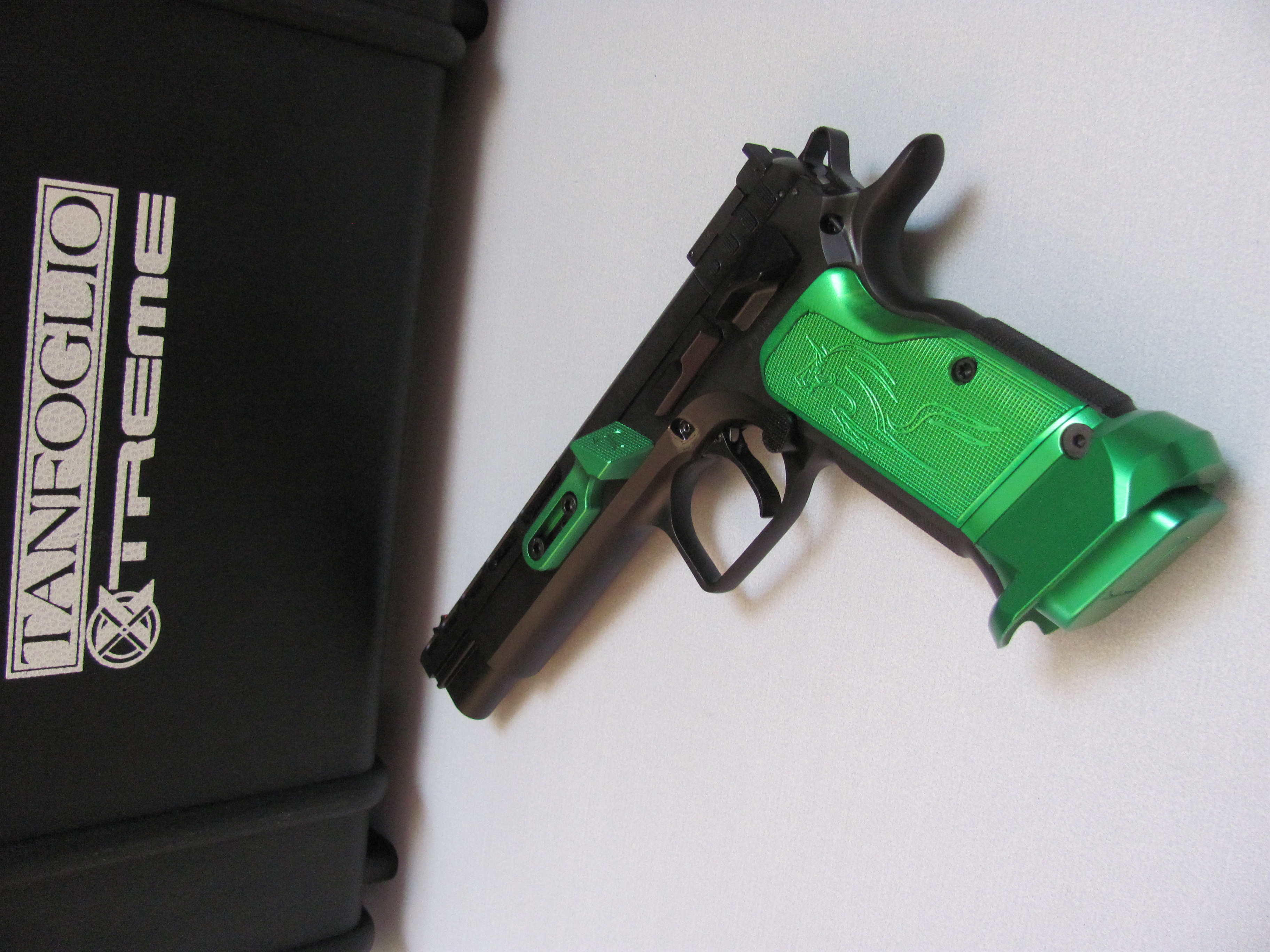 Individualisierung durch verschiedene Farbgestaltungen mit der Tanfoglio-Unica-Hausmarke ( hier ist die Pistole mit grünen Anbauteilen mit mehreren Fotos dargestellt ).